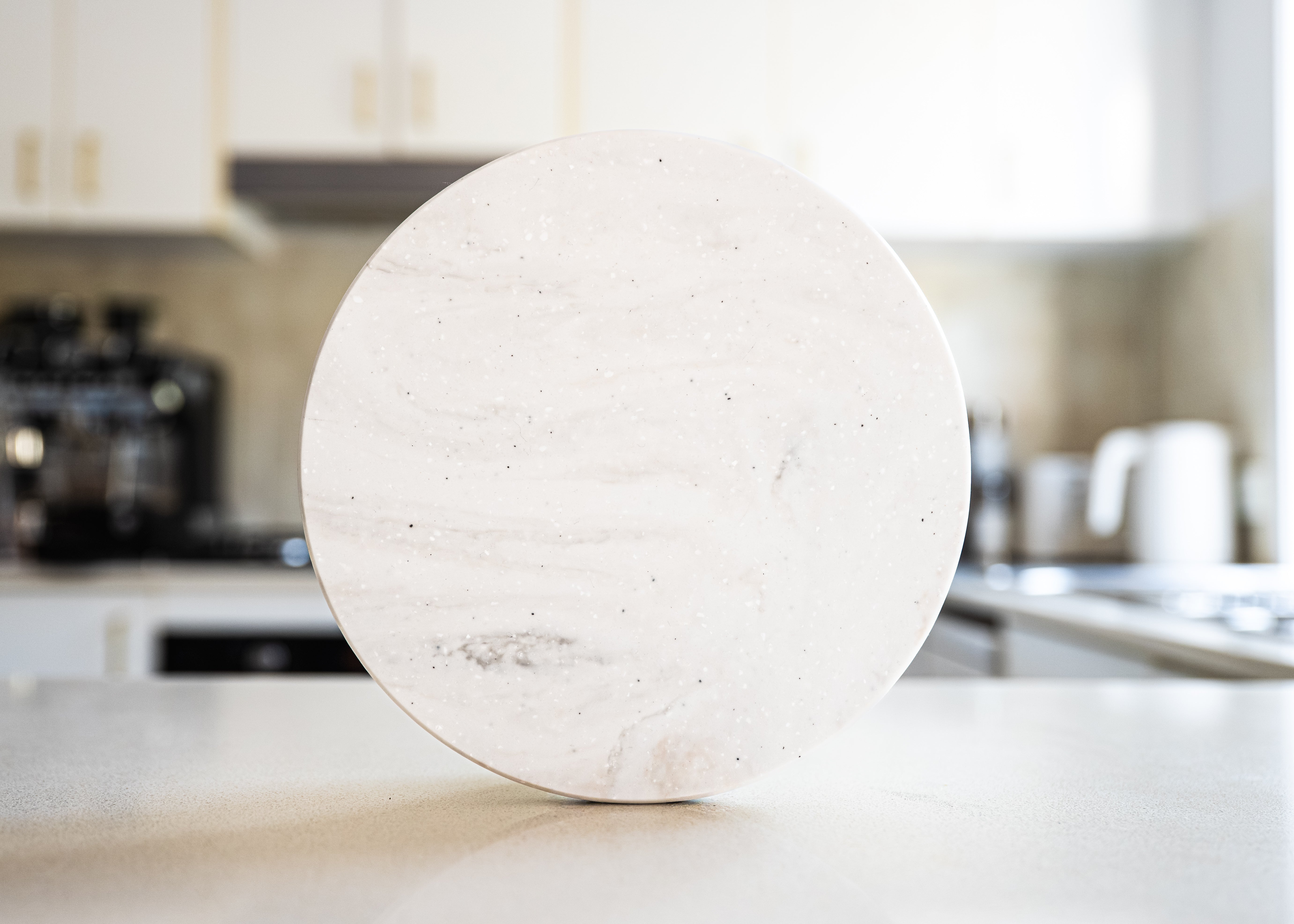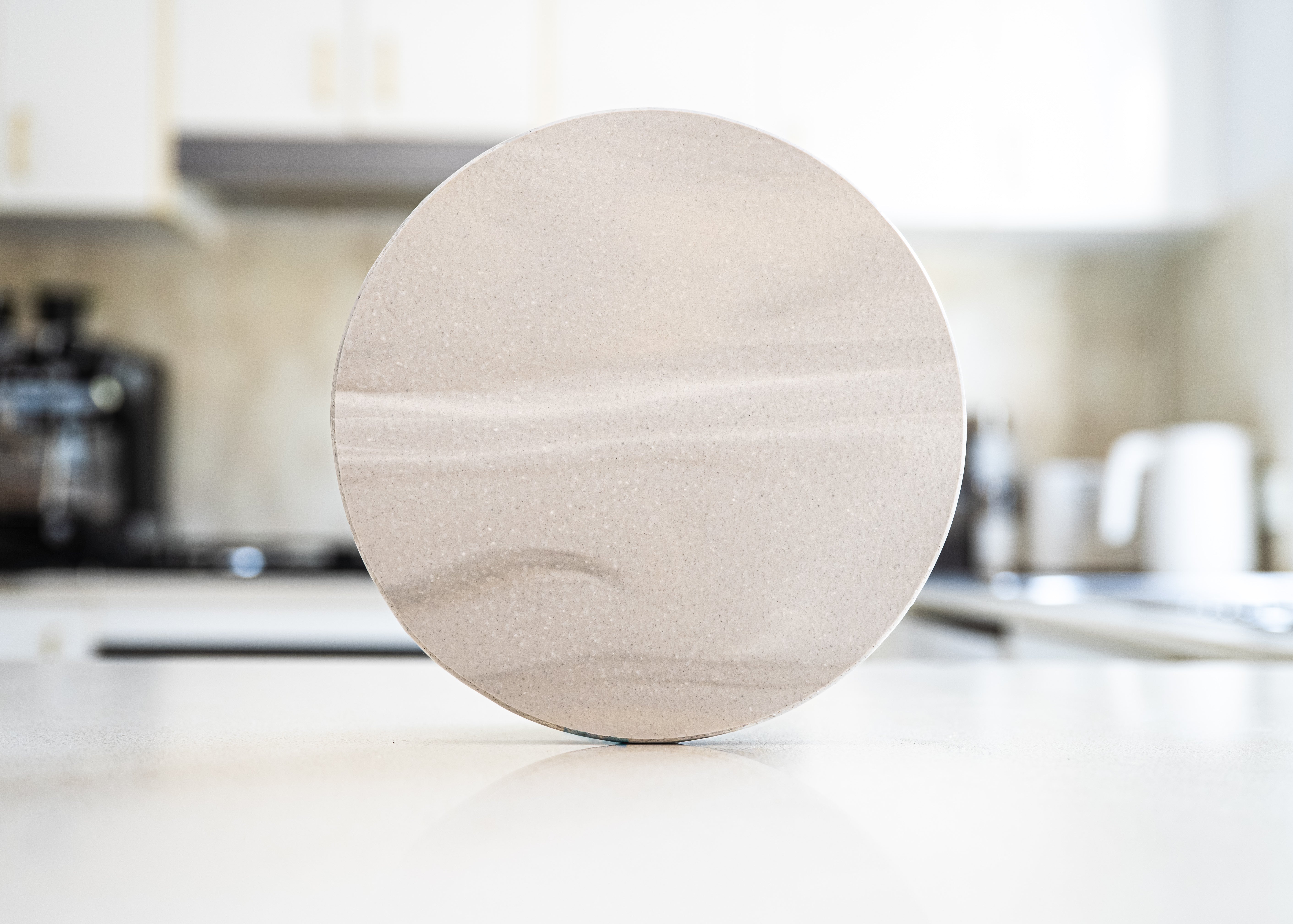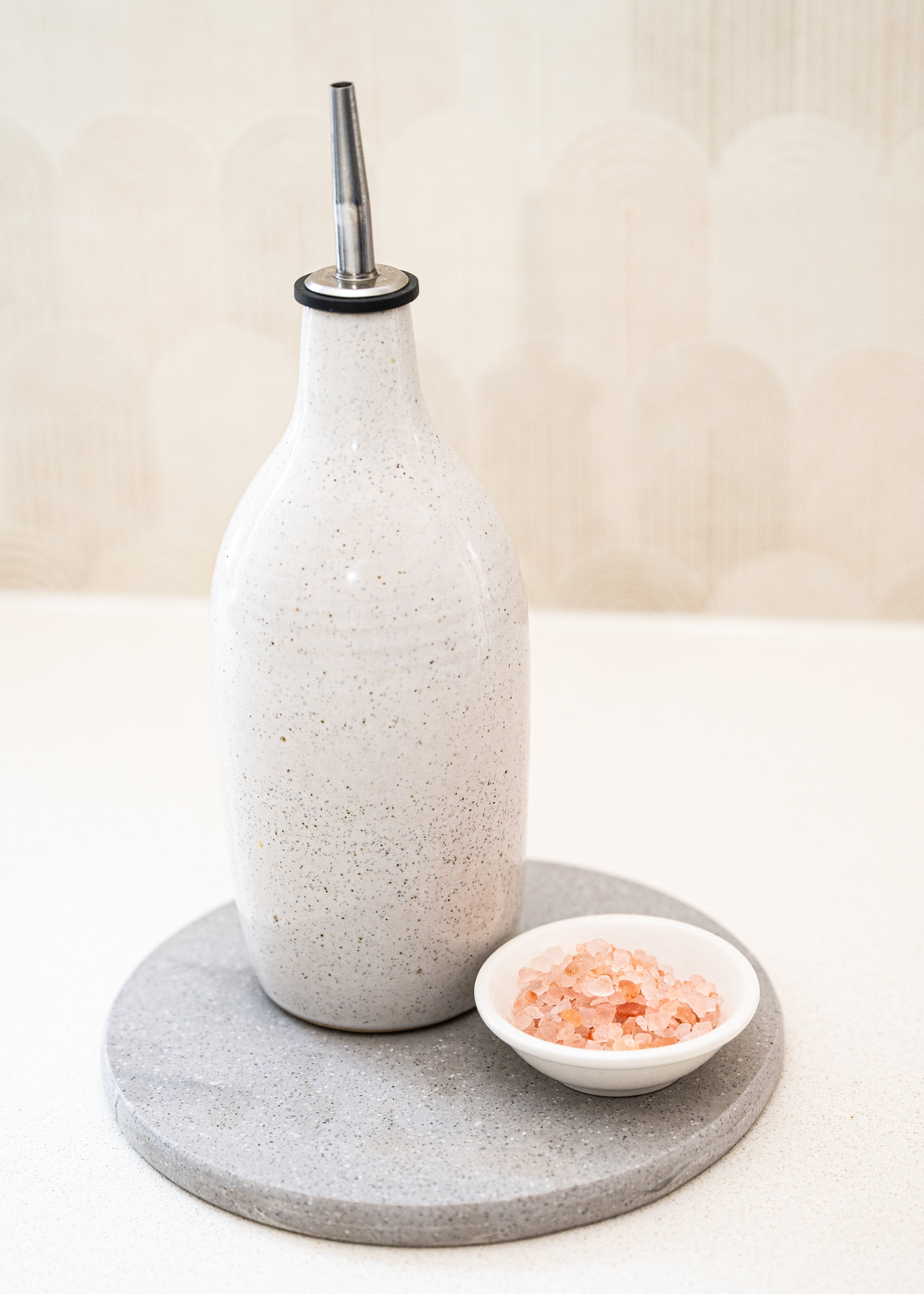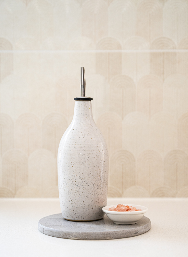 The smooth, round surface keeps your oil bottles neatly in place while protecting your counter from drips and spills. Durable, non-porous, and easy to clean — it’s a practical piece that proves sustainability can look stunning.